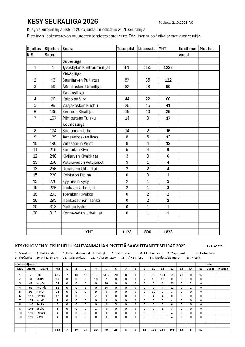 Yleisurheilun seuraliigassa Suomen Urheiluliiton jäsenseurat luokitellaan seurojen kokoamien pisteiden perusteella seuraaviin luokkiin: