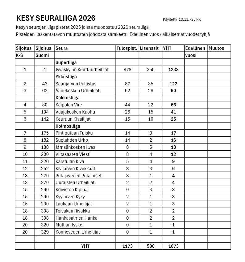 Yleisurheilun seuraliigassa Suomen Urheiluliiton jäsenseurat luokitellaan seurojen kokoamien pisteiden perusteella seuraaviin luokkiin: